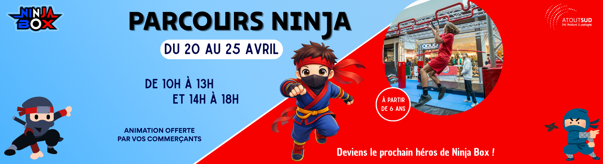 Prêt à tester tes capacités de ninja ? Du 20 au 25 Avril , plongez dans l’univers de la Ninja Box : un parcours immersif et fun, conçu pour révéler le guerrier qui sommeille en vous. ( À partir de 6 ans)